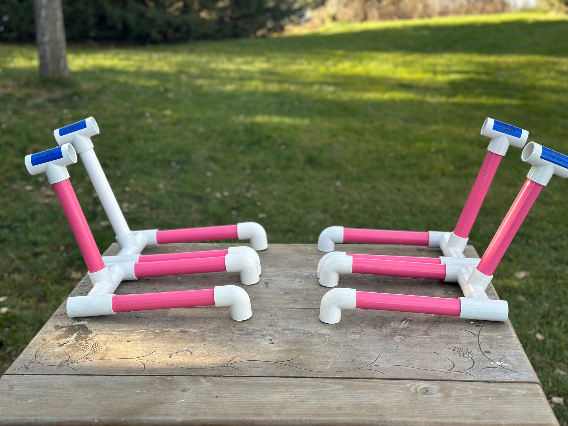 Made from Furniture Grade PVC for the legs and the upright, the tees and elbows are made from Plumbing Grade PVC. Has Eight inch legs & uprights. These could have glue residual also, ink stains from bar codes, light scratches and sanding marks on the upright.